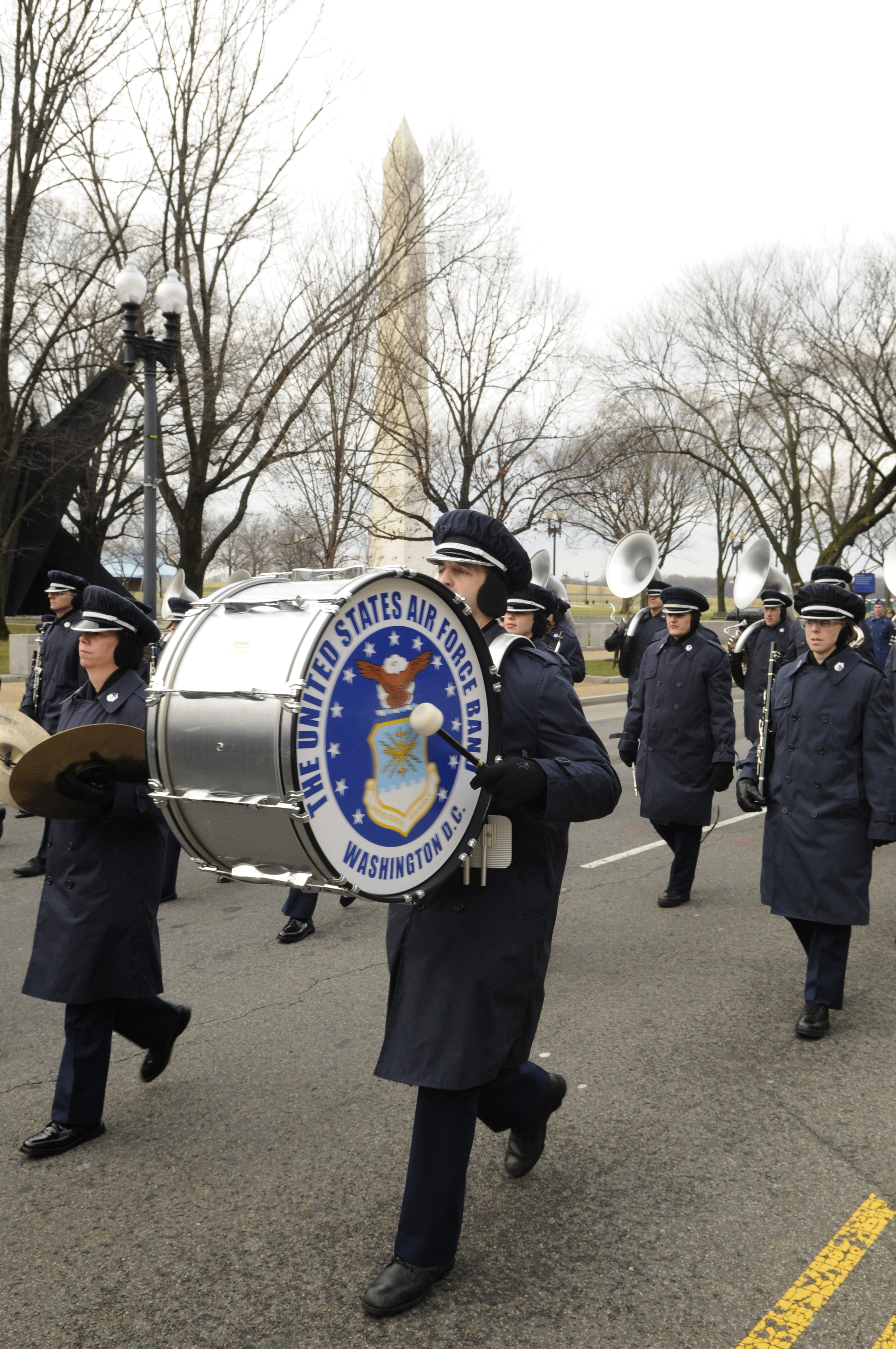 Members of the United States Air Force Band march down Constitution Avenue Jan. 11 in Washington during a practice run of the inauguration parade for President-elect Barack Obama. (U.S. Air Force photo by Senior Airman Tim Chacon)
