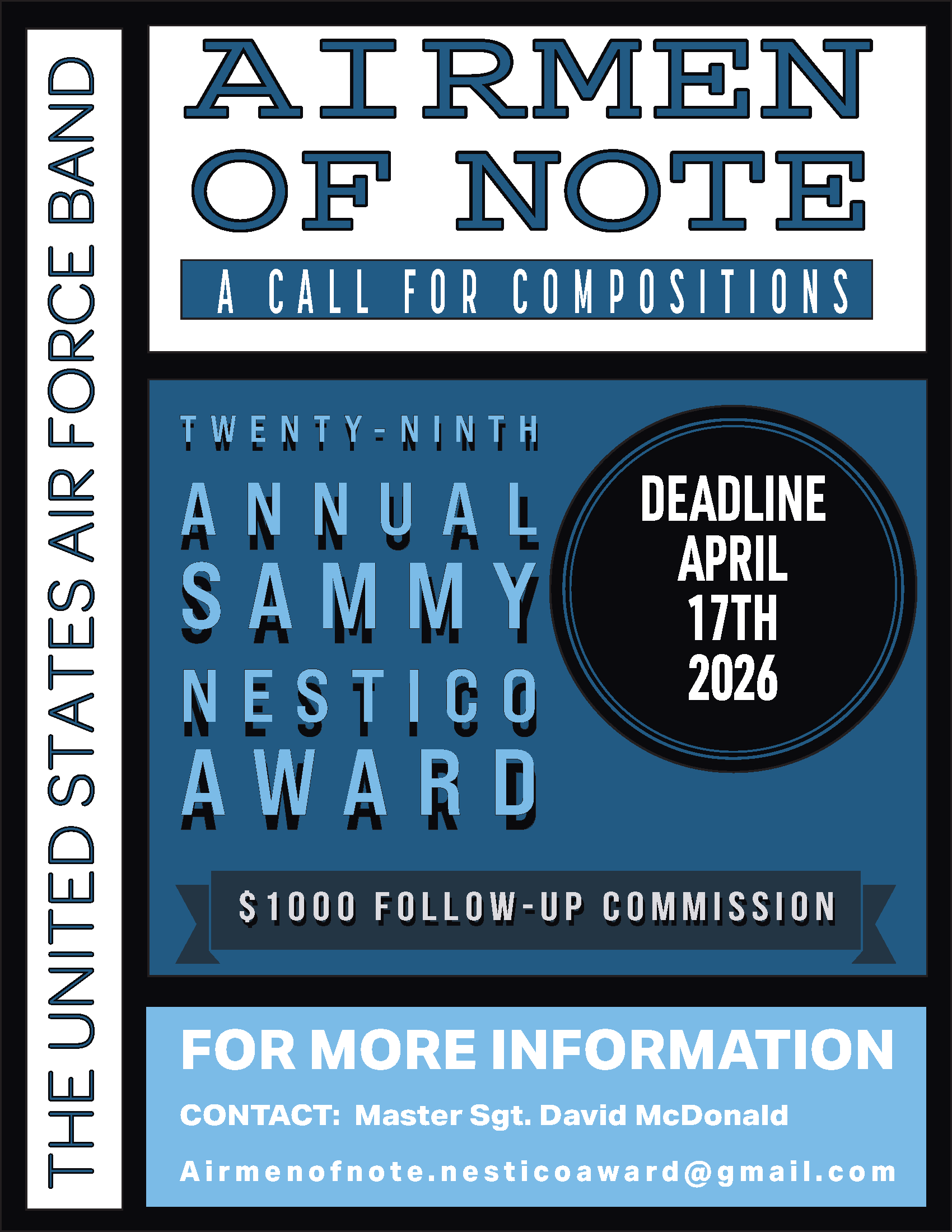 Entry Materials: Please send a full score in PDF format, with composer’s name and title removed from the work. The PDF file should be saved using the following convention: LAST NAME, FIRST NAME_TITLE.pdf. Please include a reference recording. Live recordings are greatly preferred, but MIDI versions will be accepted. Composer will retain all ownership/publication rights. The U.S. Air Force Band will neither publish nor distribute compositions. All applicants should send email correspondence and submission materials to: airmenofnote.nesticoaward@gmail.com
