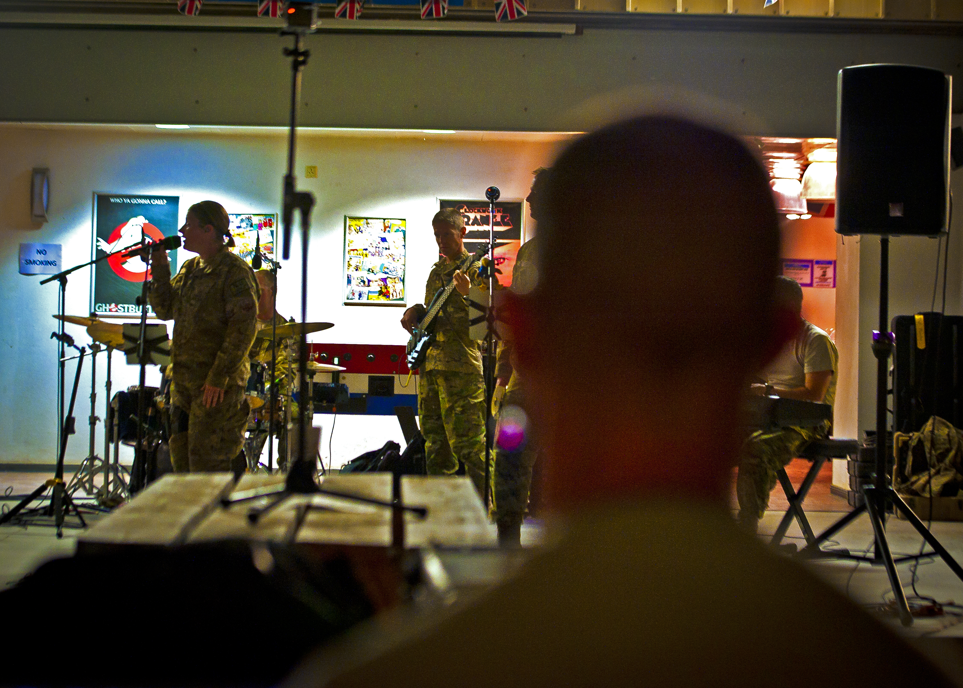 The Air Force Central Command Band “Vector” performs at the Hero’s Cafe on Kandahar Airfield, Afghanistan, April 16, 2013. (U.S. Air Force photo/Senior Airman Scott Saldukas)