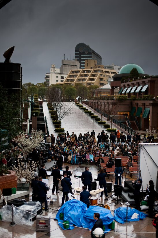 EBISU GARDEN PLACE, Japan -- Band of the Pacific-Asia jazz combo "Final Approach" plays for over 250 people at the Cherry Blossom Centennial opening, Ebisu Garden Place, Tokyo, Japan, Mar. 31, 2012. Despite the weather, Final Approach successfully completed thier mission with much audience participation. (U.S. Air Force photo/Staff Sgt. Josh Voyles)