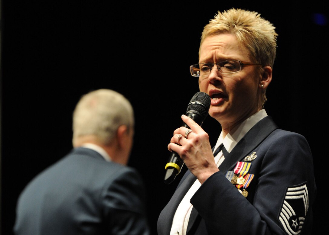 Chief Master Sgt. Angela Burns performs during a concert featuring The U.S. Air Force Band’s Concert Band and Singing Sergeants at the College of DuPage in Glen Ellyn, Ill, April 4, 2014. Burns a native of Wilmington, N.C., is an alto vocalist and the flight chief of the Singing Sergeants. She began her Air Force career in 1994. (U.S. Air Force photo/Master Sgt. Tammie Moore)