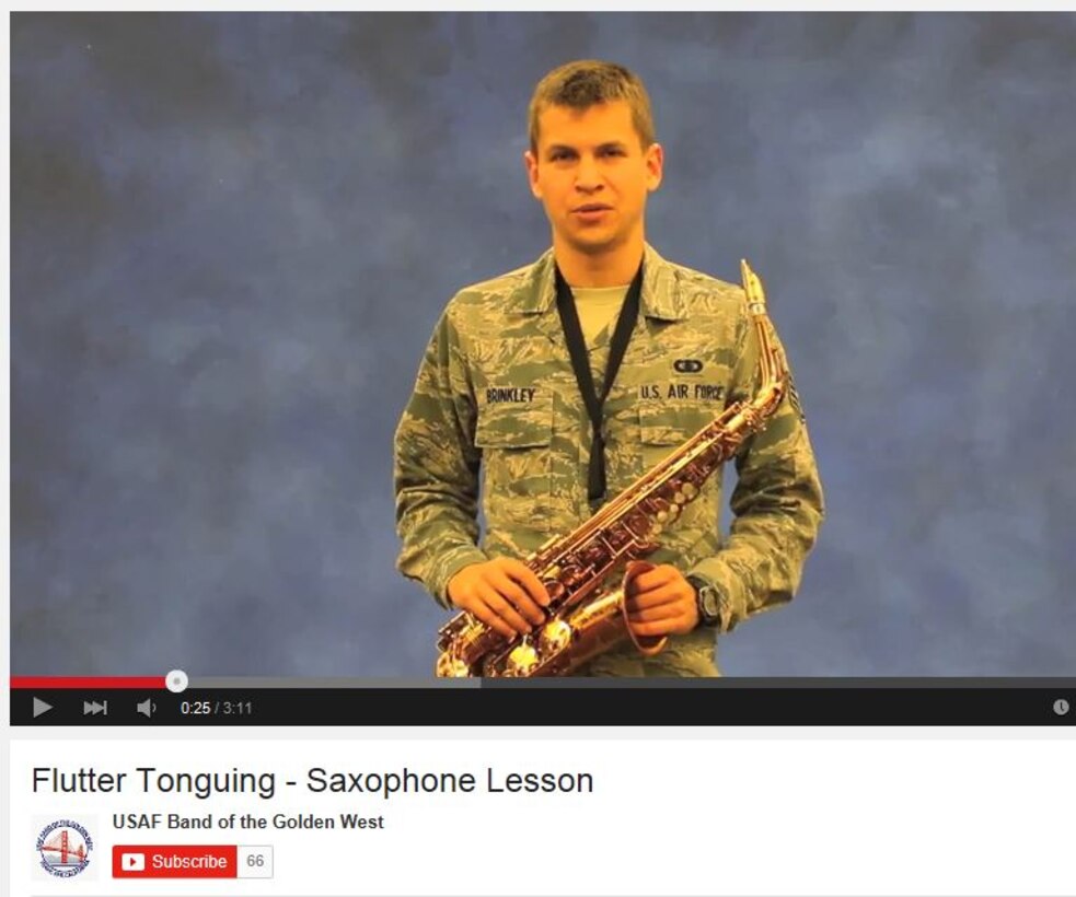 Staff Sgt. Caleb Brinkley presents a saxophone lesson on flutter tonguing in a YouTube video for the Band of the Golden West (courtesy photo)