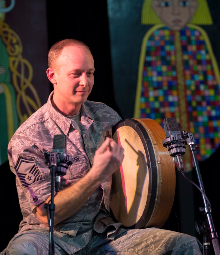 Senior Master Sgt. Dennis Hoffman, U.S. Air Force’s Celtic Aire percussionist, plays the Bodhrán during the North Texas Irish Festival in Dallas, Texas, March 4, 2016. This year’s festival was themed “Legends and Legacy” to highlight some of the true legends of Irish music as well as emerging musicians. (U.S. Air Force photo/Senior Airman Ryan J. Sonnier/RELEASED)