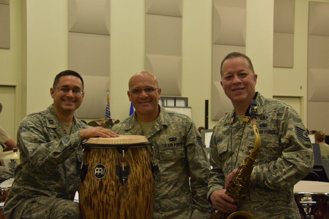 From left, U.S. Air Force Capt. Rafael Toro-Quiñones, commander and conductor of the Band of the Golden West, U.S. Air Force Staff Sgt. Wilfredo Cruz, on solo percussion and Tech. Sgt. Marco Muñoz, composer, pose for a photo during rehearsal at Travis Air Force Base, California, June 22, 2018. (U.S. Air Force photo by Senior Airman Mary Gant/Released)
