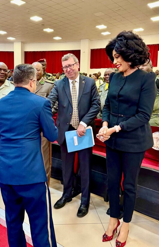 After a joint performance at the Memorial Pierre Savorgnan de Brazza, Lt. Col. Rafael Toro-QuiƱones, commander, U.S. Air Forces in Europe-Air Forces Africa Band, shake hands with U.S. Ambassador to Congo Eugene Young and the director of the memorial, Belinda Ayesse. The USAFE-AFAFRICA Band serves as a bridge to increase cultural ties and enrich the partnerships between the U.S. and Republic of the Congo through music. (U.S. Air Force photo by 2Lt Jay Sconyers)