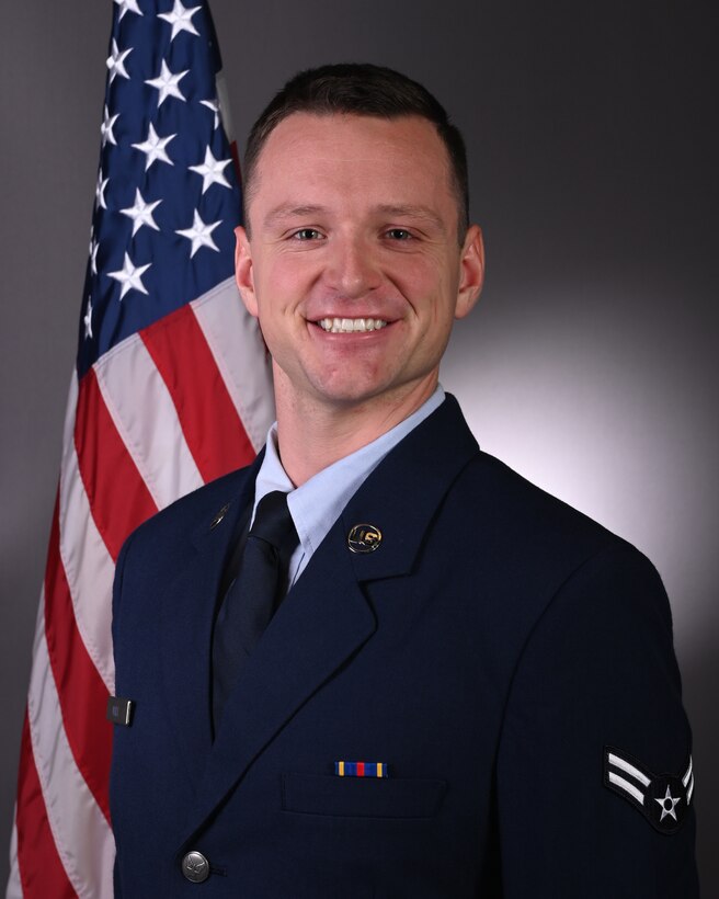 Official photo of A1C Christopher Hall in front of the American flag. He is wearing his blue service dress uniform